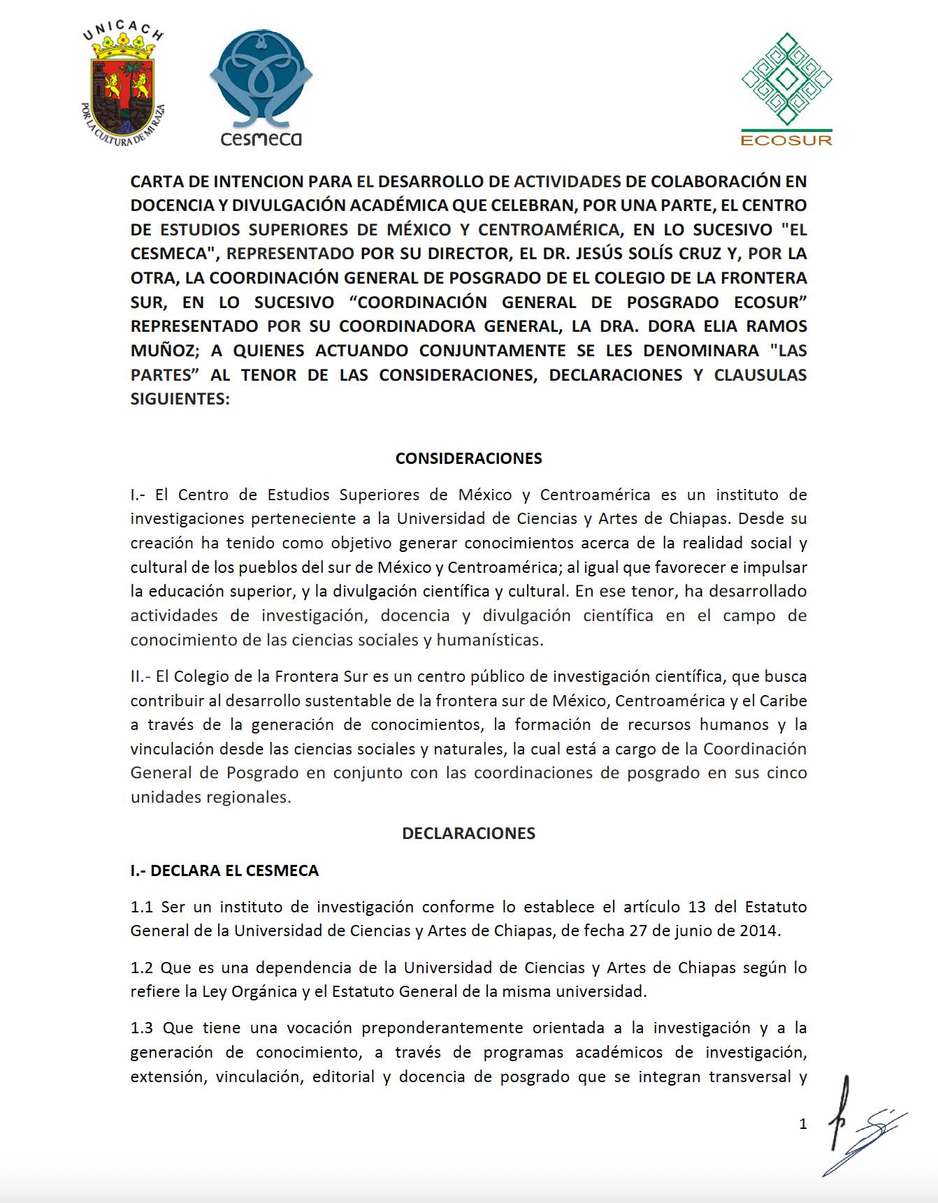 View DetailsEl Colegio de la Frontera Sur (ECOSUR)2.1. Carta de intención para el desarrollo de actividades de colaboración en docencia y divulgación académica. Gestionado por el CESMECA. Vigencia indet