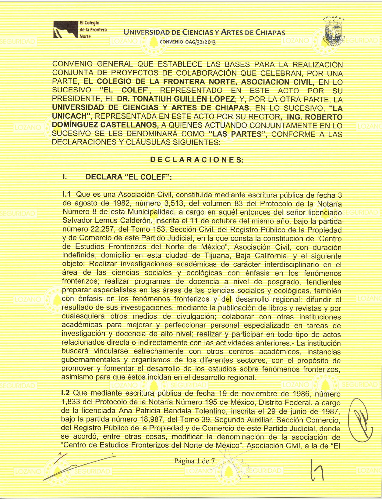 EL COLEGIO DE LA FRONTERA NORTE9.1. Convenio marco de colaboración indefinido firmado en febrero de 2013. Gestionado por el CESMECA (Dr. Daniel Villafuerte). 9.2. Convenio específico para intercambi