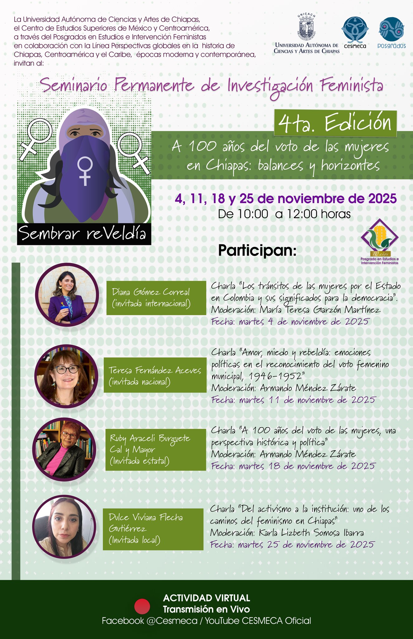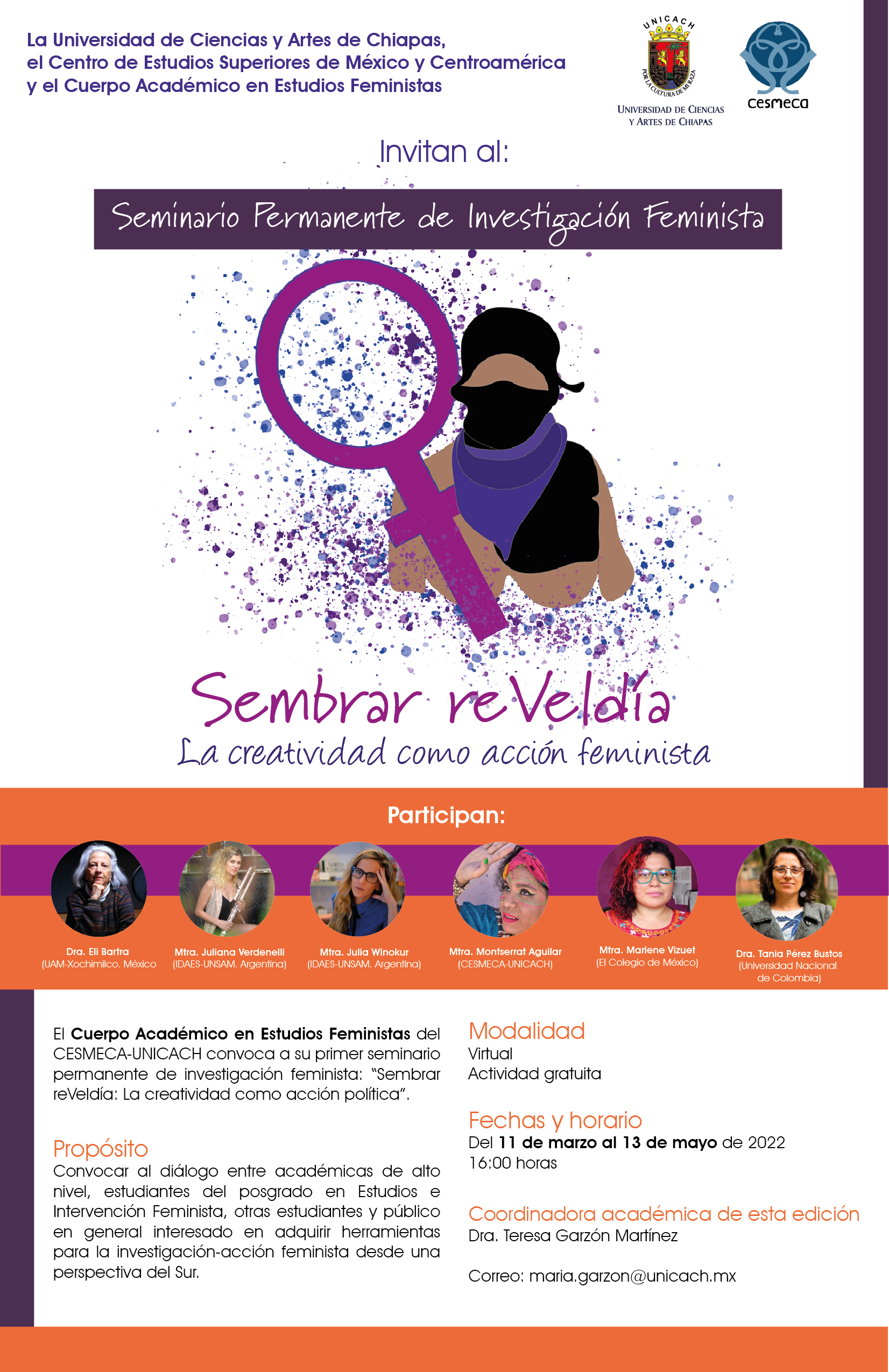 Este seminario convoca al diálogo entre académicas de alto nivel, estudiantes del Posgrado en Estudios e Intervención Feministas, así como otras personas interesadas en adquirir herramientas para la investigación-acción feminista desde una perspectiva del Sur.